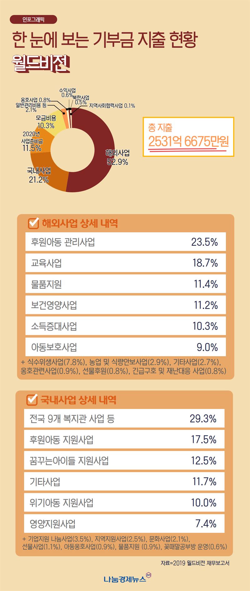 월드비전은 지난해 총지출 중 52.9%를 해외사업에, 21.2%는 국내사업에 사용했다. [자료=월드비전/그래픽=차민수기자]