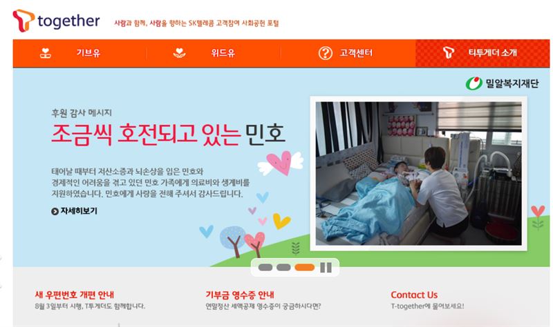 '티투게더'. SK텔레콤의 사회공헌 사이트다. 이곳에는 후원하고 싶은 사례에 레인보우 포인트(SK텔레콤이 특정 요금제를 사용하는 고객에게 매월 적립하는 포인트),OK캐쉬백(SK플래닛에서 운영되는 마일리지 서비스) 같은 포인트를 기부할 수 있다.