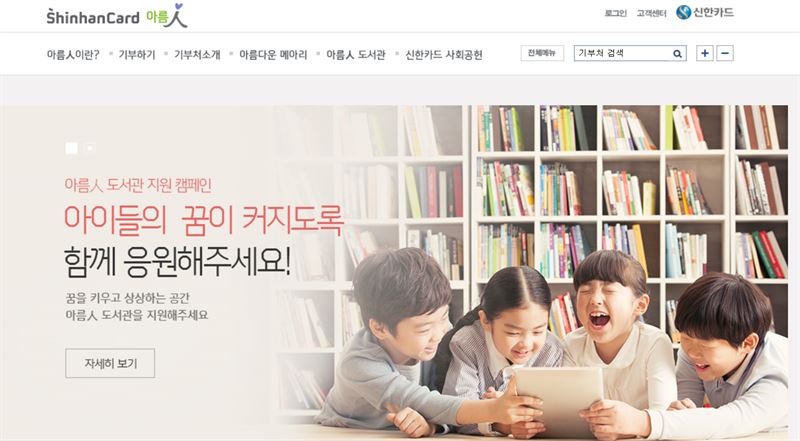 신한카드는 아름인(人)이라는 사회공헌 브랜드가 있다. 신한 아름다운 카드 사용시 적립되는 아름 포인트와 일반 신한카드 사용시 적립되는 'My 신한포인트', 'LOVE 포인트'로 기부할 수 있다.