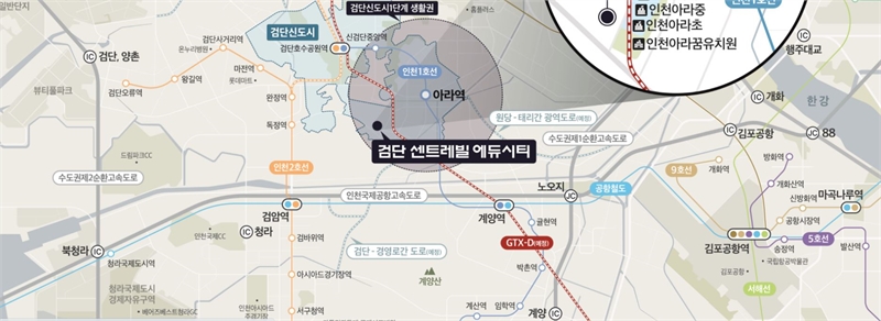 지난 6월 말 개통된 인천지하철 1호선 검단연장선 아라역이 있으나, 도보로 이용하기에는 먼거리다.그러나 역세권은 아니지만, 유치원부터 초·중·고가 있는 학세권인데다 브랜드나 세대수 등이 눈길을 끌고 있다.