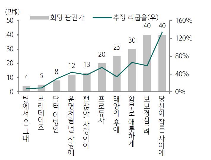 연간 누적 기준으로는 '더 킹'이 12위를 기록하고 있다. 이기훈 연구위원은 국내에서의 다소 아쉬운 시청률과는 달리 글로벌에서 높은 성과가 확인되고 있는 점은 향후 넷플릭스향 판매 작품수 뿐만 아니라 가격(율) 상승에 매우 긍정적인 변화라고 판단했다.